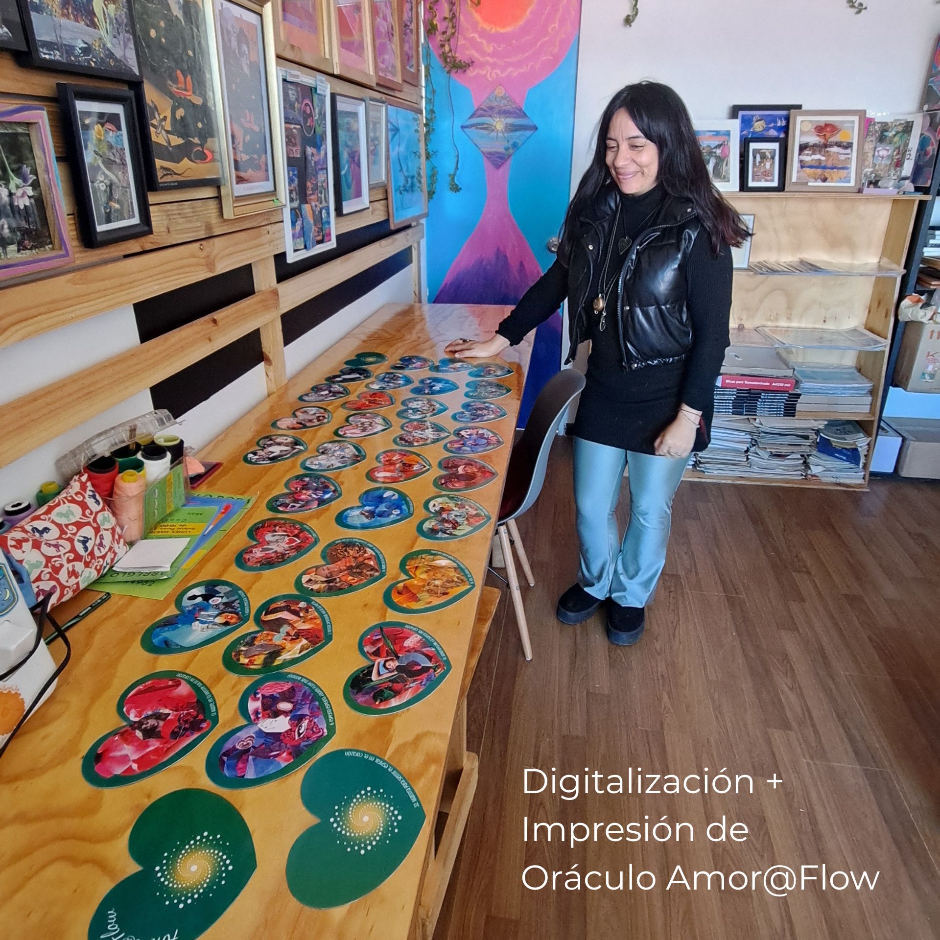 Digitalizo tu obra, diagramo su versión final para postales, prints, stickers, cartas de oráculo u otros formatos, e imprimo todo para que tu creación se materialice en piezas listas para compartir o vender.